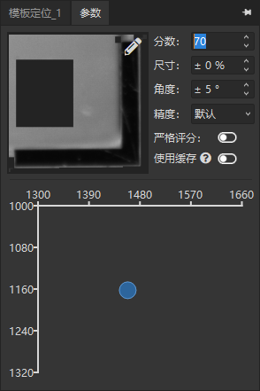 分?jǐn)?shù):對(duì)匹配到的模板相似度進(jìn)行評(píng)判,分?jǐn)?shù)越高,匹配相似度的要求越高; 尺寸:可匹配的模板尺寸范圍,例如±50%,就是模板的50%~150%大小范圍內(nèi)進(jìn)行匹配; 角度:可匹配的模板角度范圍,例如±180°,就是360°任意方向進(jìn)行匹配;; 精度:根據(jù)精度及速度的要求,用戶可以選擇從粗略到高的五個(gè)等級(jí); 嚴(yán)格評(píng)分:是否對(duì)在評(píng)分中考慮丟失、遮擋或模糊的特征; 使用緩存:加速算法的執(zhí)行速度,但是會(huì)占用額外的內(nèi)存; 全圖檢測(cè):用戶點(diǎn)擊如下圖所示的中ROI最大化按鈕即可。