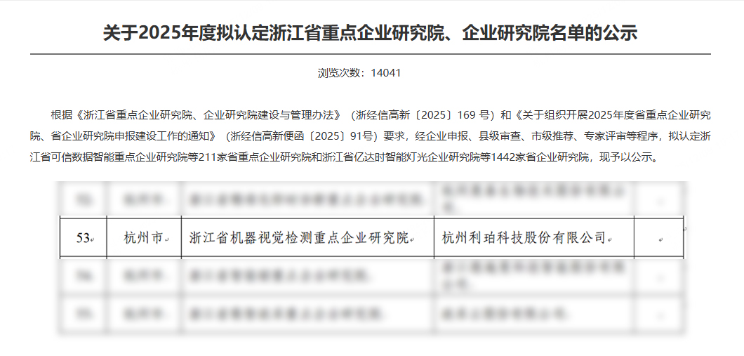 浙江省經(jīng)濟(jì)和信息化廳發(fā)布2025年度省級(jí)企業(yè)研究院認(rèn)定名單,利珀科技申報(bào)的“浙江省機(jī)器視覺(jué)檢測(cè)重點(diǎn)企業(yè)研究院”成功入圍,被認(rèn)定為“浙江省重點(diǎn)企業(yè)研究院”。