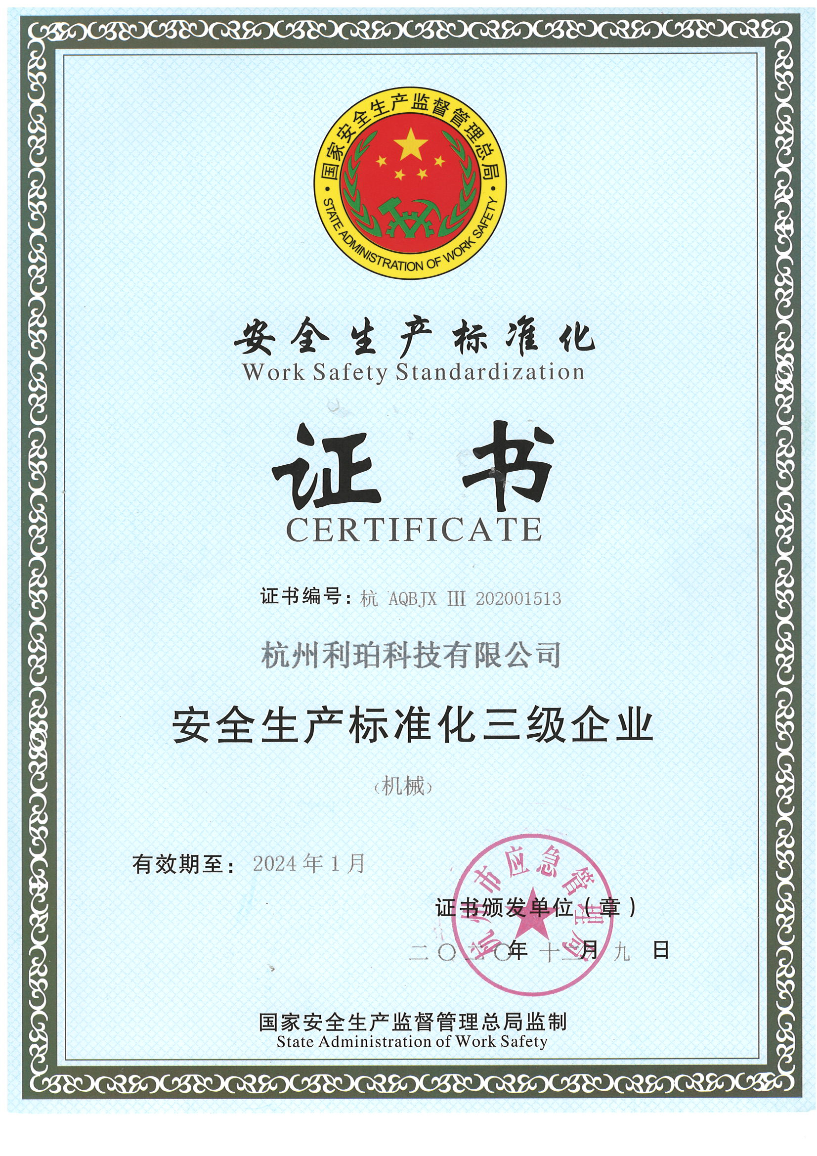 安全生產(chǎn)標(biāo)準(zhǔn)化證書