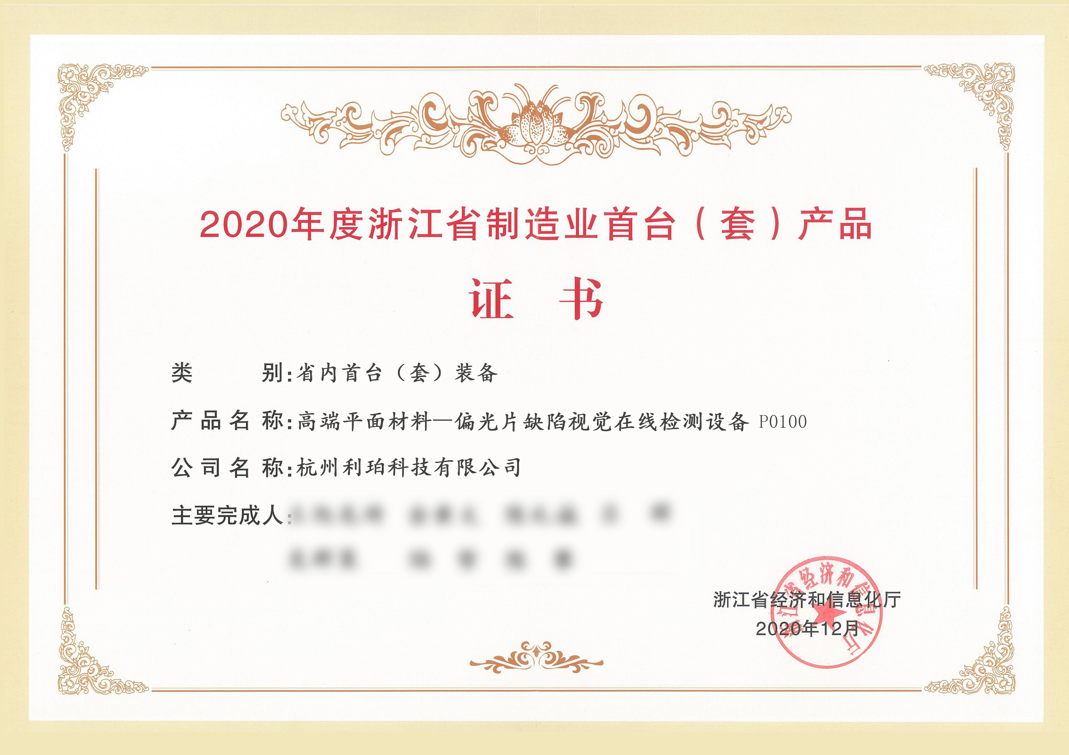 2020年度浙江省制造業(yè)首臺(tái)(套)產(chǎn)品證書-省內(nèi)首臺(tái)套裝備...