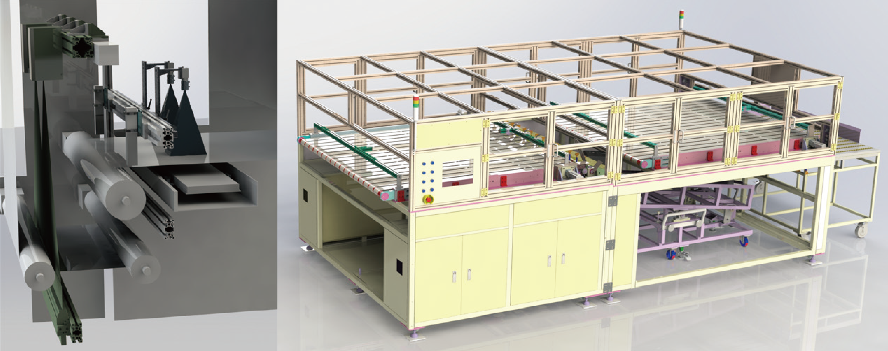 該設(shè)備對(duì)接RTS裁切機(jī),將AOI安裝于裁切機(jī)上,分揀機(jī)安裝于裁切機(jī)后段;可對(duì)帶缺陷Marking的卷材進(jìn)行檢測(cè),對(duì)裁切后的片材進(jìn)行精準(zhǔn)的OK/NG分類,并進(jìn)行收料。